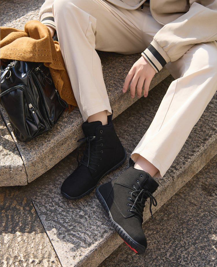 Bottes d'hiver confortables pour pieds nus avec tige en microfibre douce comme du daim et doublure en polaire pelucheuse pour plus de chaleur et de confort.